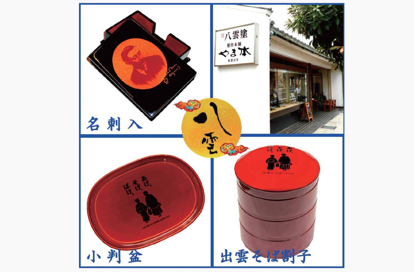創業140年。松江で唯一、年月を経る毎に鮮やかになる八雲塗の制作販売を行っているお店です。金箔を使用した八雲白檀琥珀、ガラスを素材とした八雲びいどろの他、鏡や箸、島根の独特の器「割子」が人気です。店舗奥にある工房では見学や絵付体験もできます。